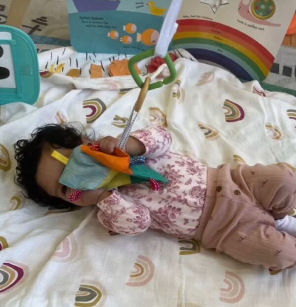 Comes with tags is a comfort Fabric Square toy with comes with soft ribbon tags and a wooden teether ring. This travel-friendly sensory toy can be connected to the car seat and play gym easily with provided Velcro link. Help in soothing babies during their early developmental stages and parental supervision is must.
